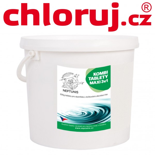 Pak se vloží do plováku nebo zásobníku tablet 1 ks KOMBI TABLETY MAXI na 20-30 m3 vody v bazénu. Toto množství by mělo stačit na udržení potřebné koncentrace 0,3-0,5 mg/l aktivního chloru ve vodě na 5 až 10 dnů v závislosti na faktorech, které ovlivňují množství aktivního chloru ve vodě, jako jsou teplota vzduchu a vody, intenzita slunečního záření a zatížení bazénu. Kontrolu správné koncentrace aktivního chloru a pH je třeba provádět pravidelně vhodným testerem. Přípravek v sobě již obsahuje látky, které zabraňují růstu řas, přesto při případném výskytu řas je možné provést jednorázovou úpravu vody přípravkem CHLOR ŠOK dle návodu uvedeného na tomto přípravku.