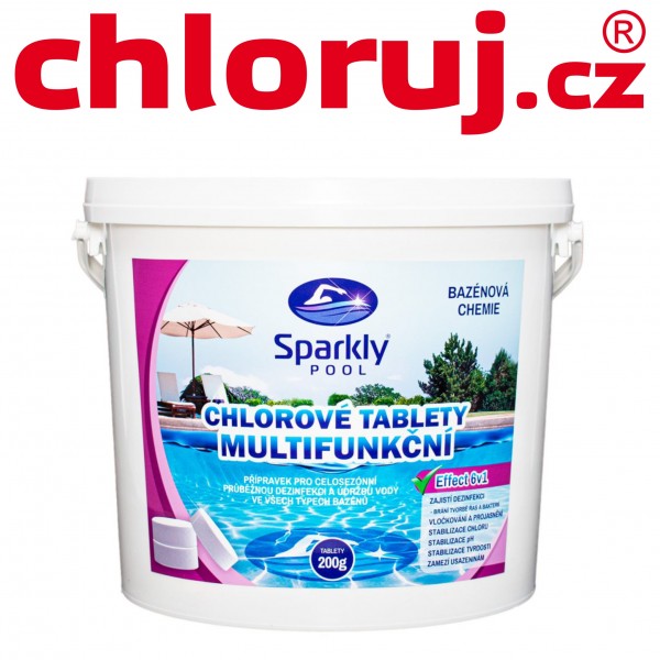 CHLOROVÉ TABLETY MULTIFUNKČNÍ Effect 6v1, je vysoce účinný beze zbytku pomalurozpustný chlorový multifunkční přípravek ve formě 200 g tablet určený k celosezónní průběžné dezinfekci a údržbě vody ve všech typech bazénů, který působí komplexně a zajišťuje 6 účinků pro zachování vysoké kvality bazénové vody. Zajišťuje DEZINFEKCI, zabraňuje tvorbě řas a bakterií. Díky flokulačnímu účinku VLOČKUJE, PROJASŇUJE a zlepšuje efektivitu filtračního systému, tím udržuje průzračnou a jiskrnou vodu. STABILIZUJE CHLOR, pH, TVRDOST a zamezuje VÁPENATÝM USAZENINÁM. Aplikací této 200 g tablety se speciálním složením lze takto ošetřit bazénovou vodu v bazénech o objemu 20 - 30 m3 po dobu 5 - 8 dnů při běžných podmínkách. Biocidní přípravek určený k prodeji spotřebiteli (TYP PT02).